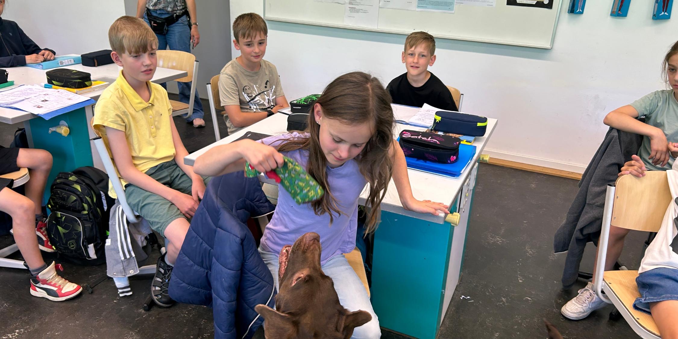 Wir sind die 5b und wir sind eine von zwei Hundeklassen. Bei uns gibt es ein paar Unterschiede im Vergleich zu anderen ,,normalen“ Klassen. Zum Beispiel werden wir öfters mal von unseren Schulhündinnen Momo oder Umba drangenommen. Dies funktioniert folgendermaßen: Eine Person stellt sich nach hinten. Dann schickt Frau Scherbring dieser Person Momo oder Umba. Die Hunde haben dann ein Säckchen mit Hundekarten im Maul und bringen dieses zu ihm oder ihr. Hundekarten sind Karten mit Hundebildern drauf. Jeder von uns hat so eine Karte mit einem anderen Hund als Bild. Eine Karte wird gezogen, diese Person ist dann an der Reihe, etwas zu sagen oder zu tun.